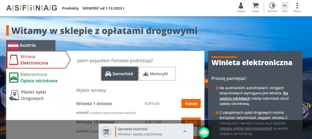 Aby zakupić winiety od austriackiej firmy, należy wejść na stronę ASFiNAG, która dostępna jest także w języku polskim.